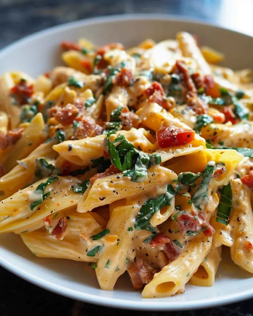 A vibrant and creamy pasta dish that combines the richness of turkey bacon with fresh Tuscan flavors, all cooked in one pot for simplicity and deliciousness.