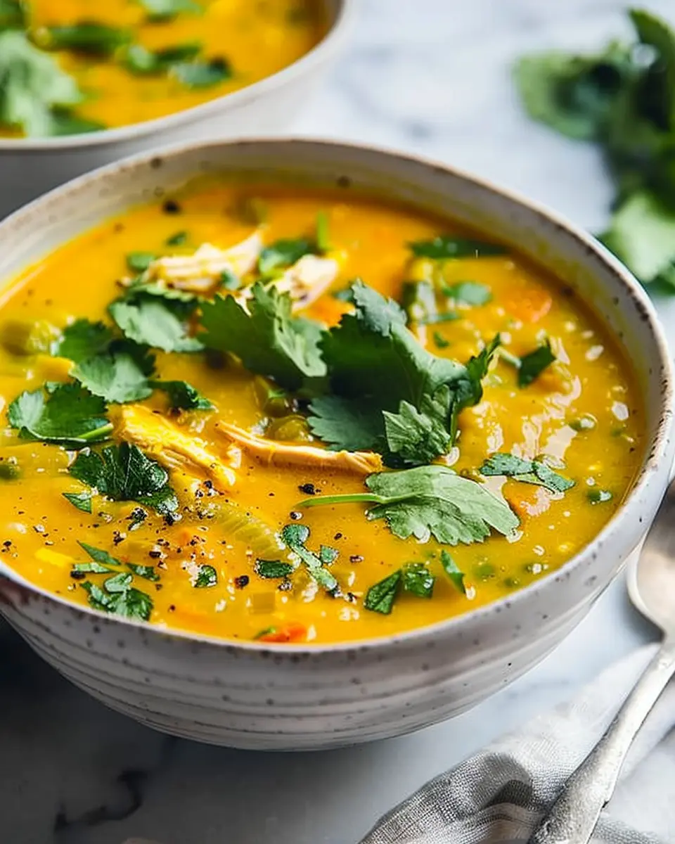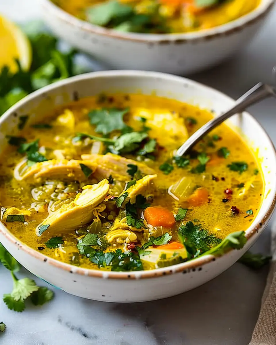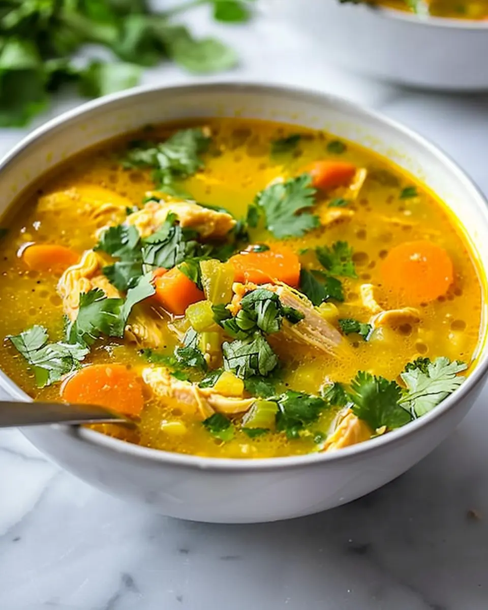 A warm and nutritious chicken soup infused with the healing properties of turmeric, perfect for a cozy meal.