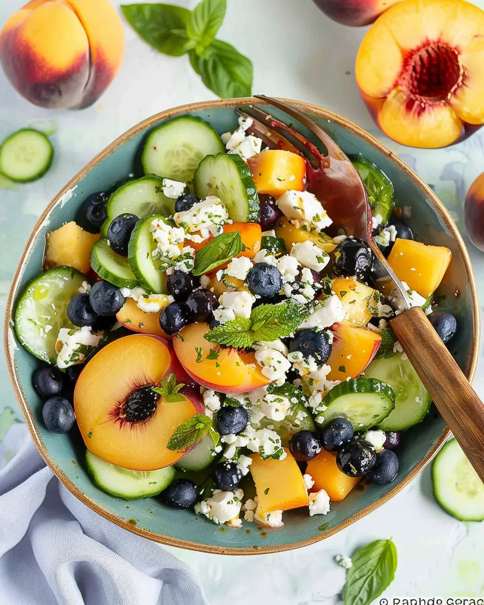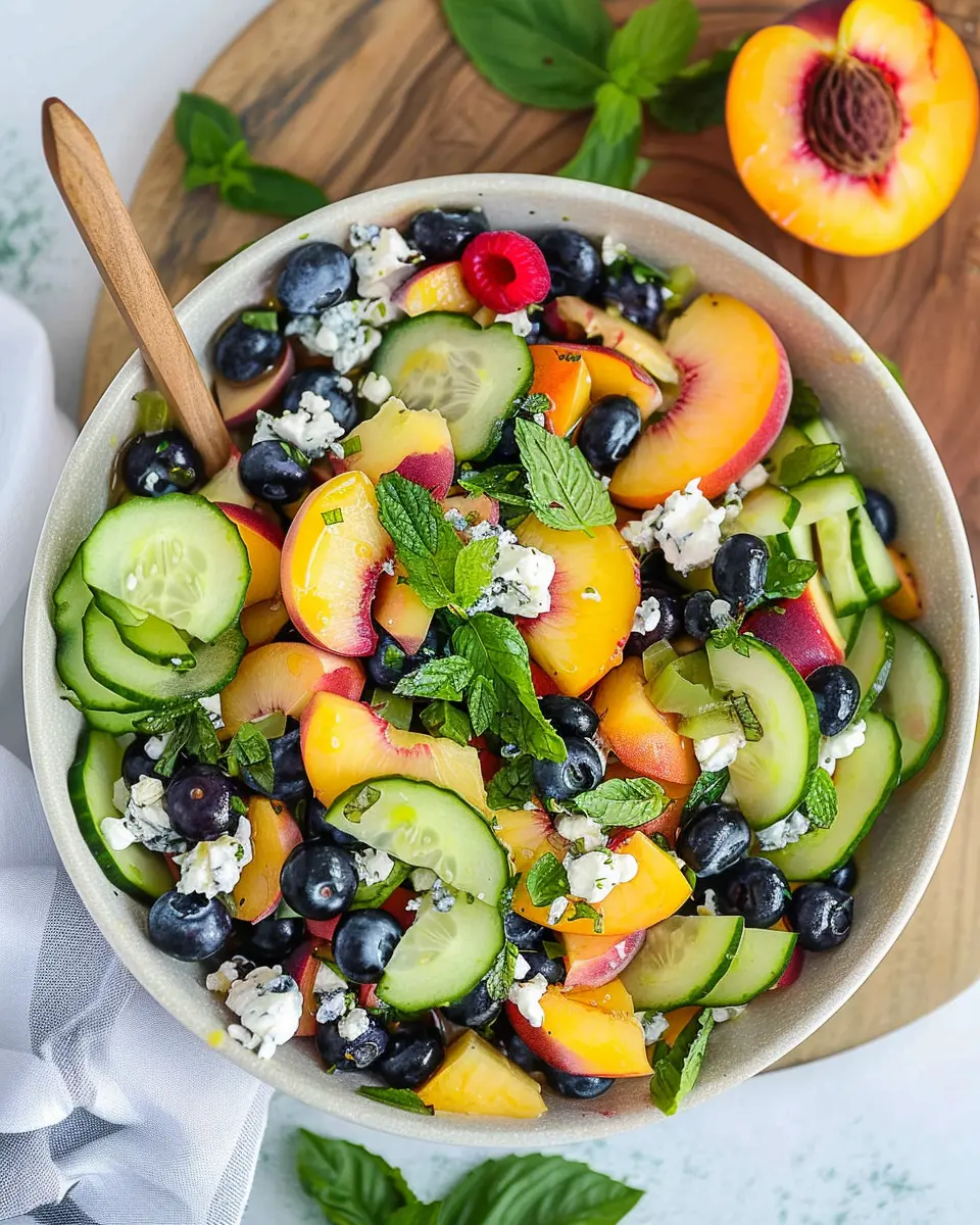 A refreshing summer salad featuring blueberries, cucumbers, peaches, and goat cheese.
