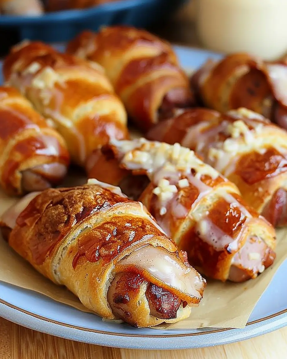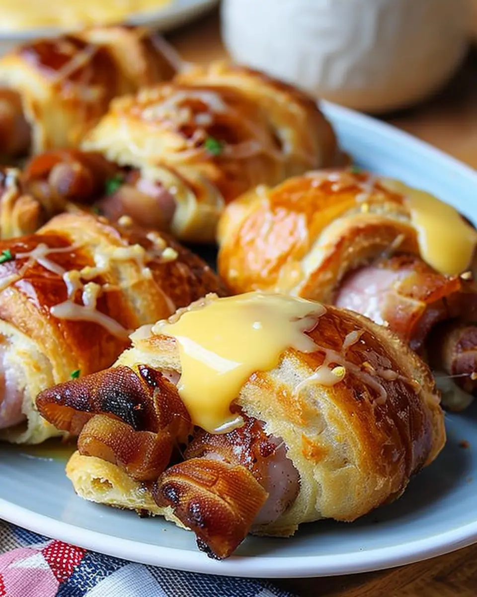 Enjoy a delicious and easy breakfast with these Breakfast Pigs in a Blanket, featuring turkey bacon and chicken ham.