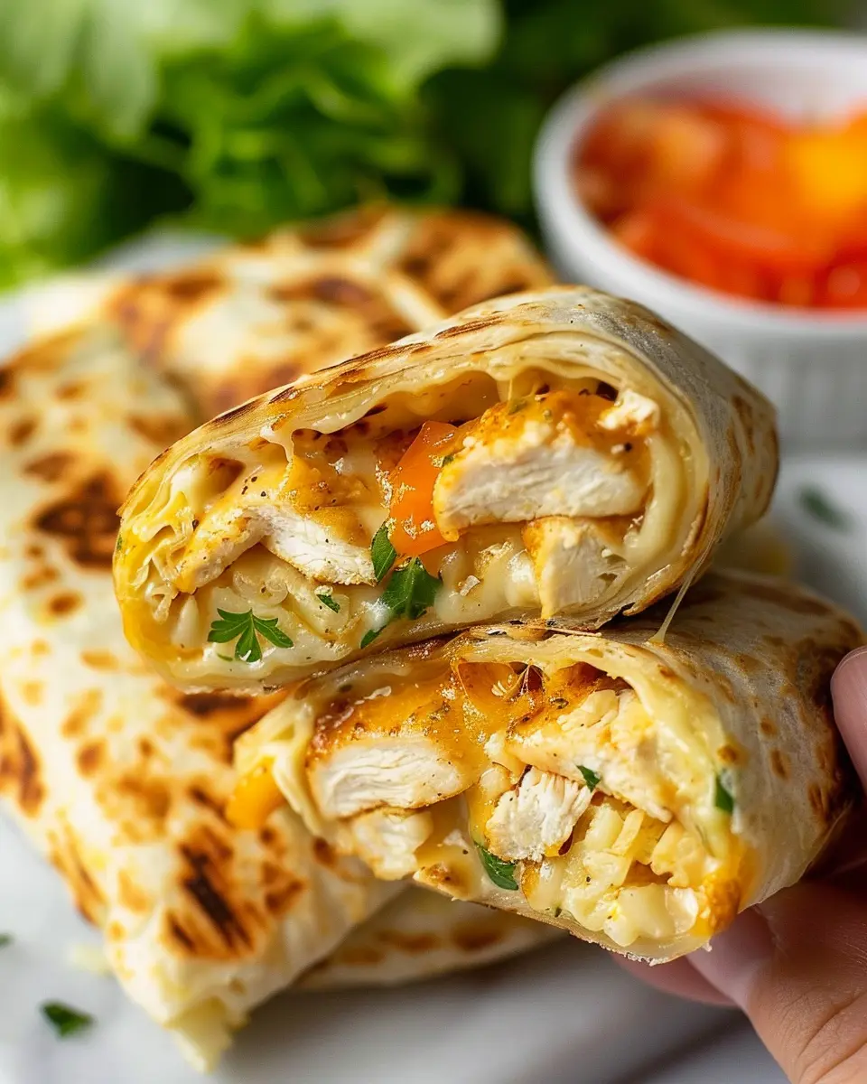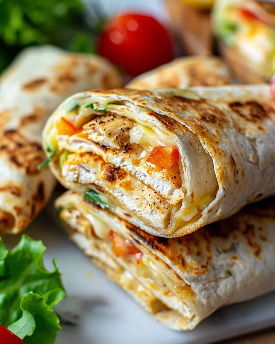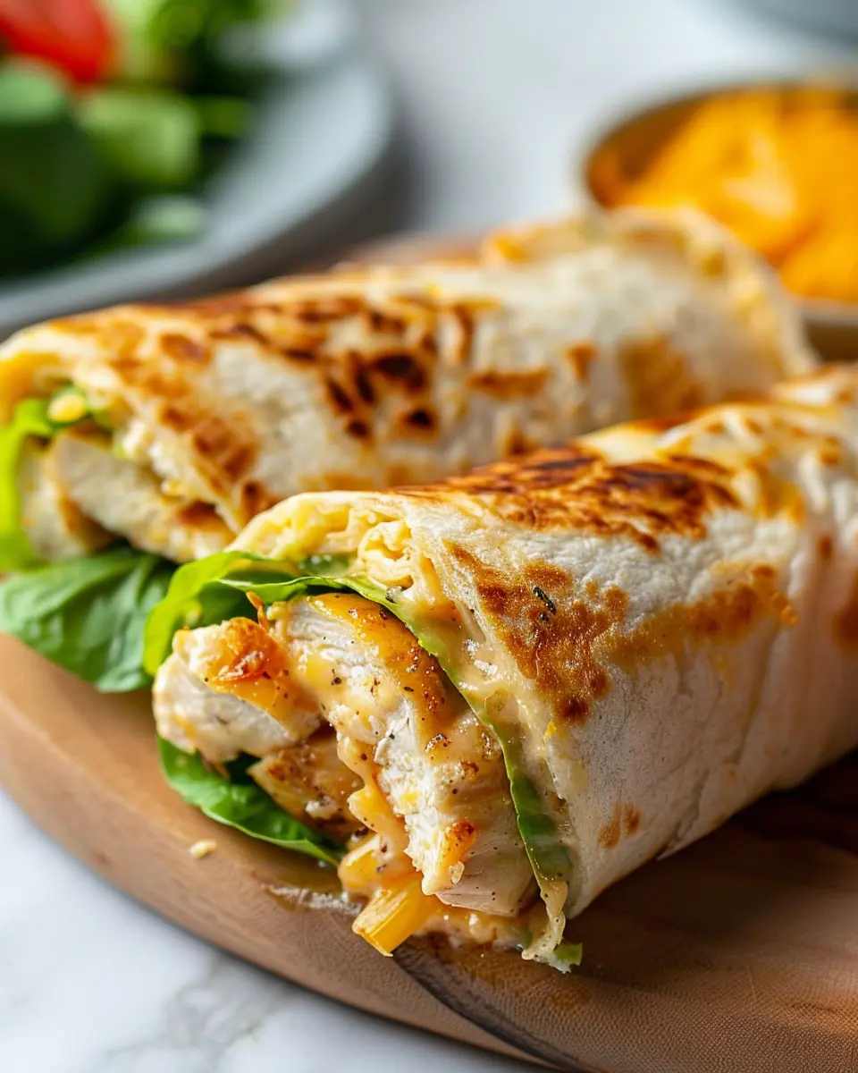 Enjoy a delicious and satisfying lunch with these easy-to-make Cheesy Garlic Chicken Wraps, perfect for on-the-go meals.