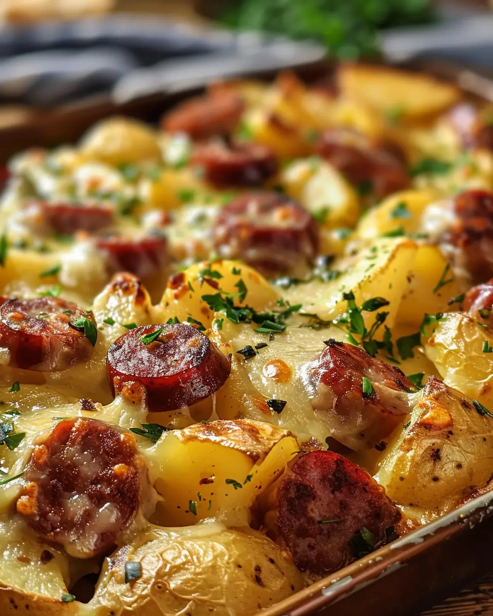 A comforting dish featuring cheesy ranch potatoes paired with smoked sausage, perfect for a cozy dinner.