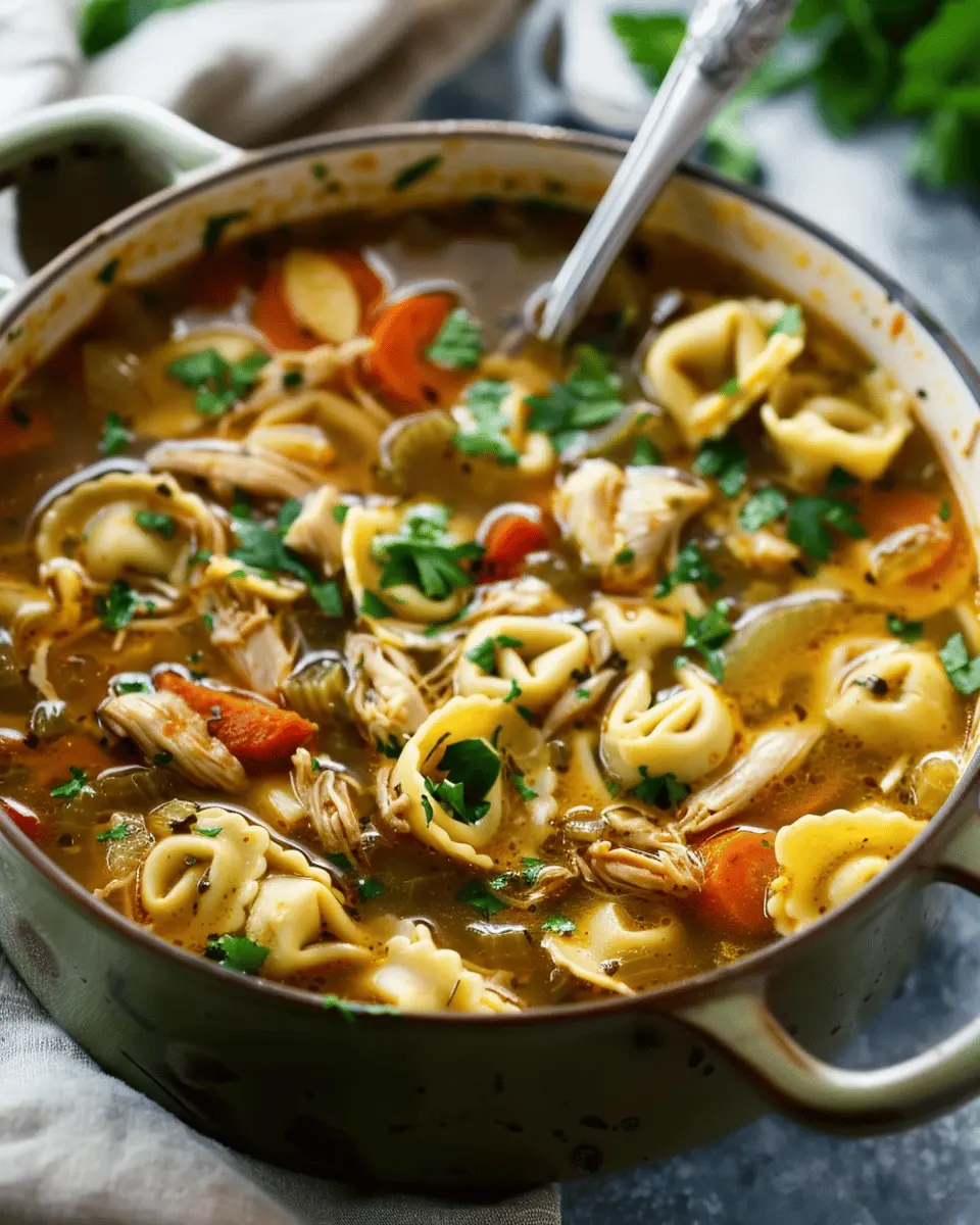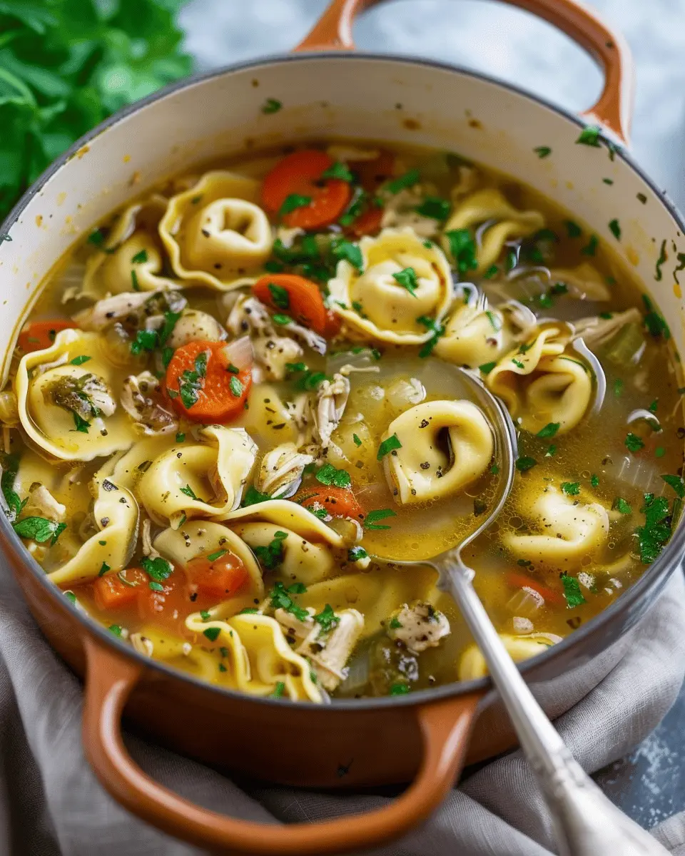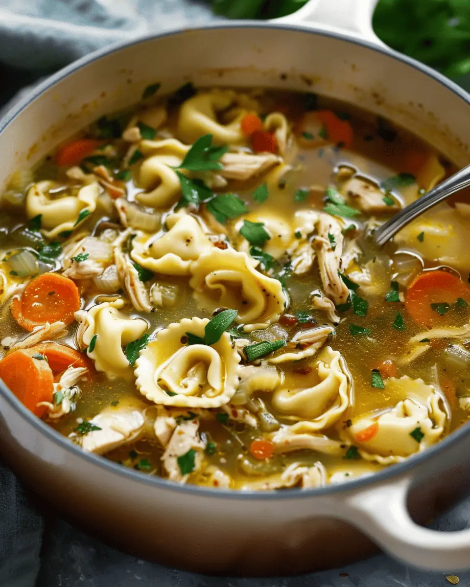 Enjoy a warm bowl of chicken tortellini soup, perfect for any occasion.