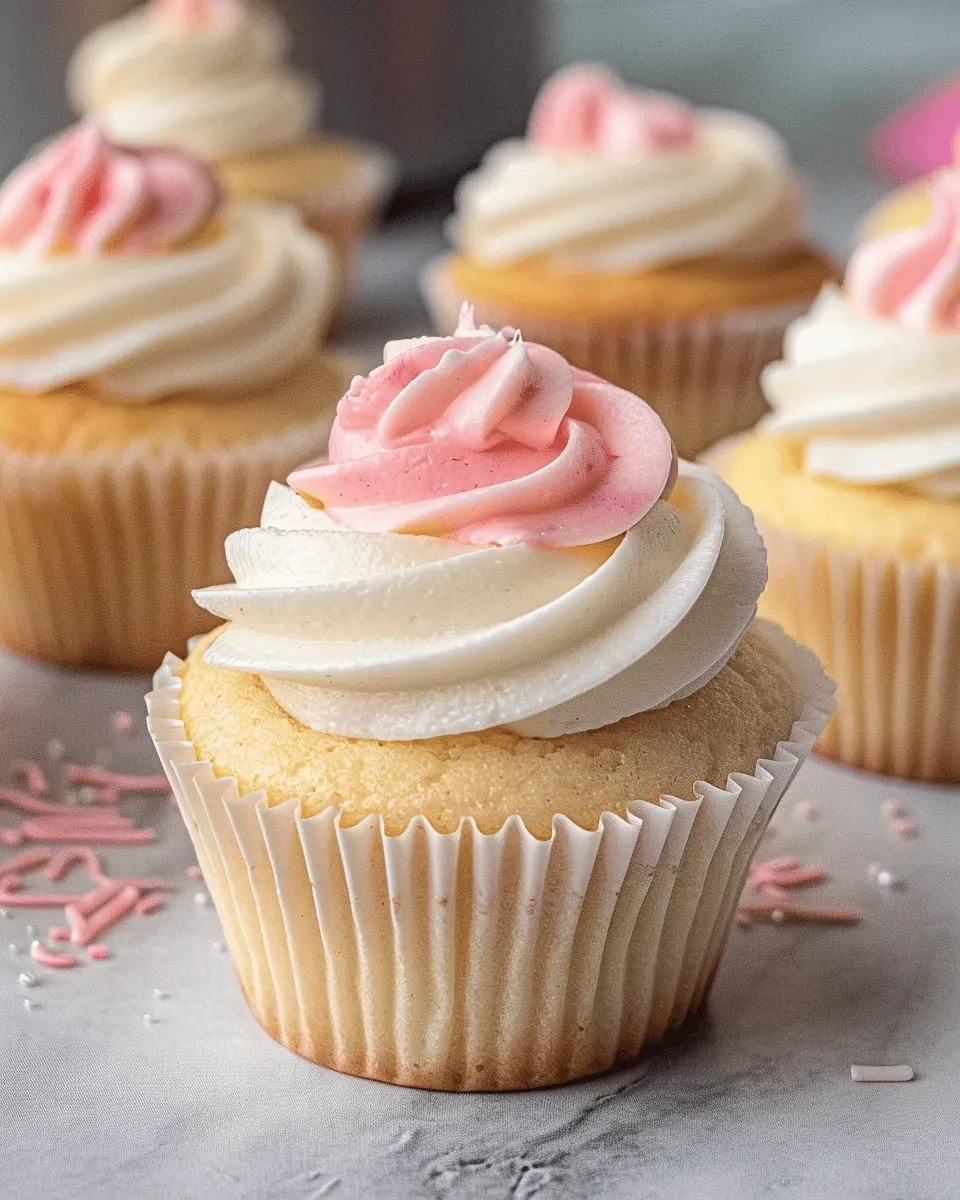 Finally, it’s time to ice those gorgeous cupcakes! With a piping bag and a star tip, elegantly swirl the pink buttercream on top of your cooled cupcakes. Not only does it add a pop of color, but it also enhances the sweetness of your cupcakes.