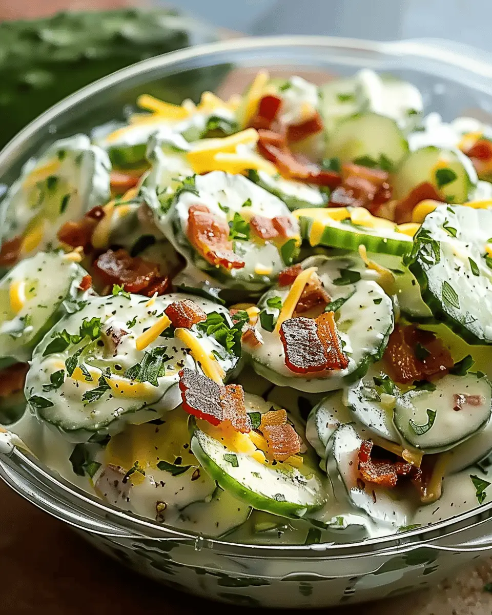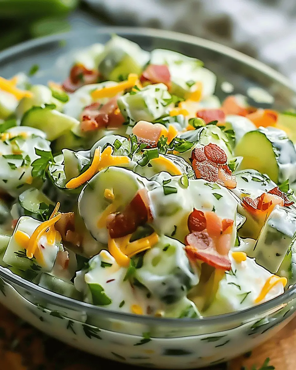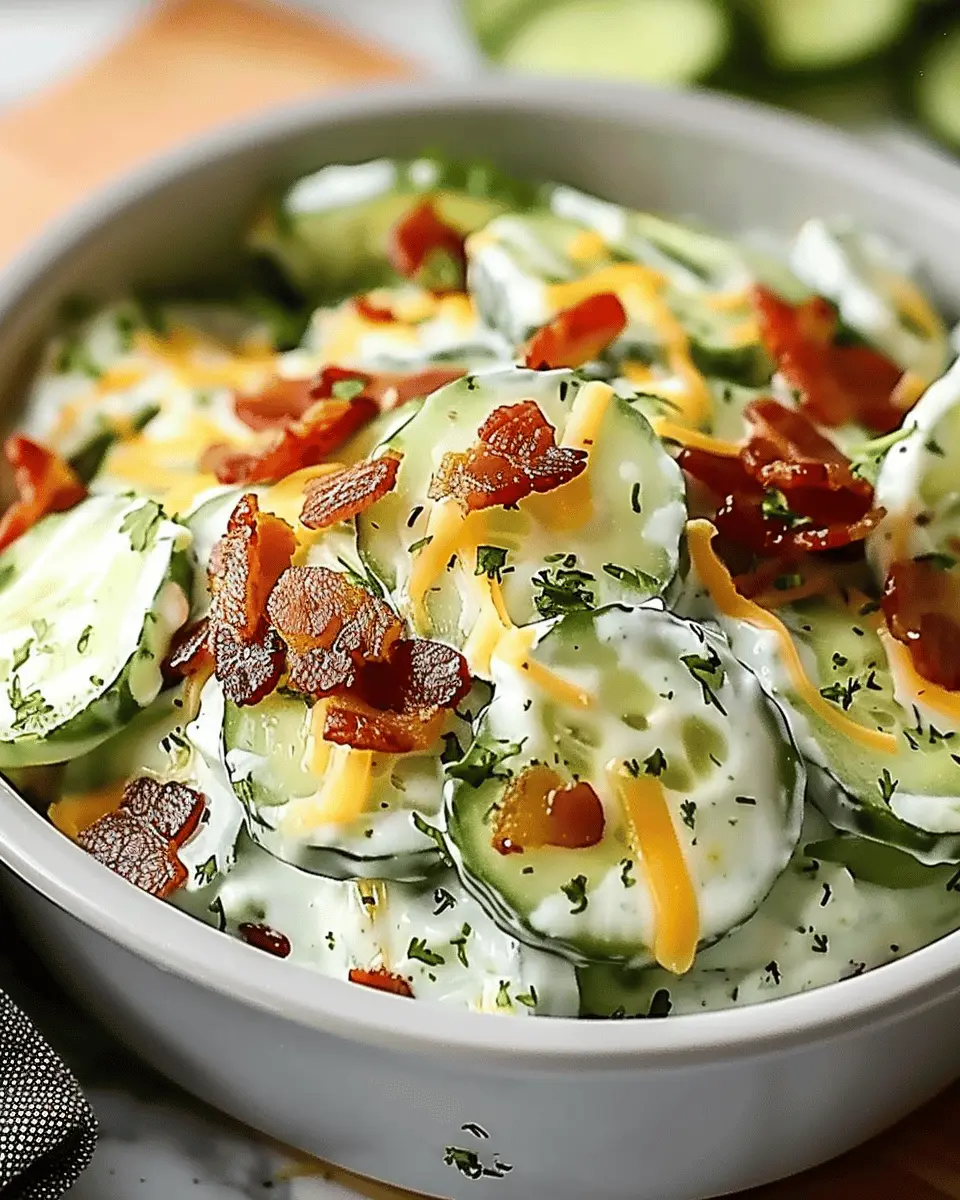 A refreshing and decadent creamy cucumber salad that perfectly combines the flavors of crunchy cucumbers, crispy bacon, and rich cheese.