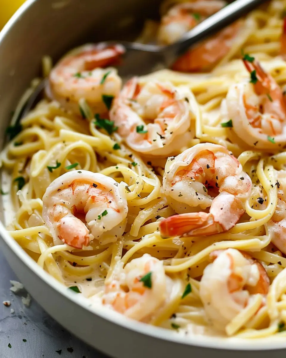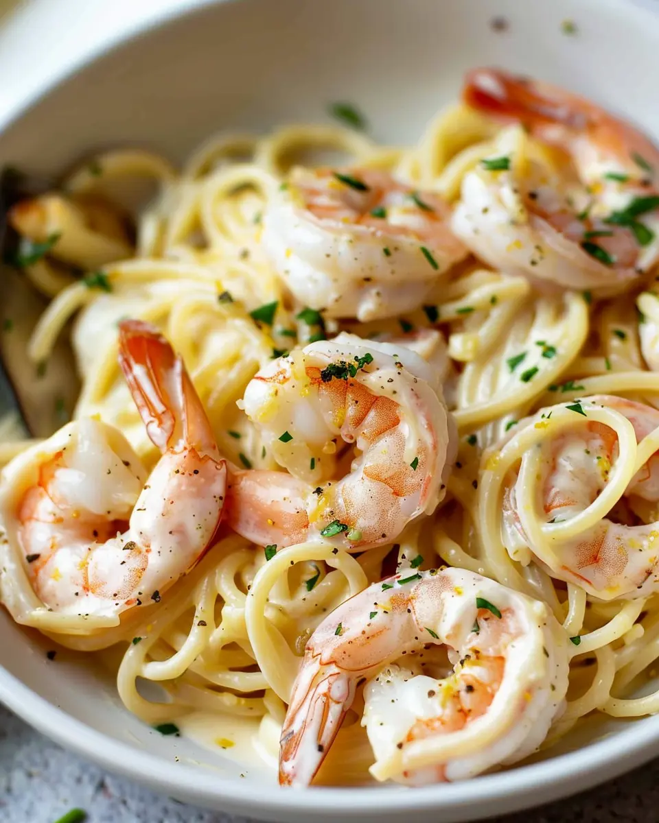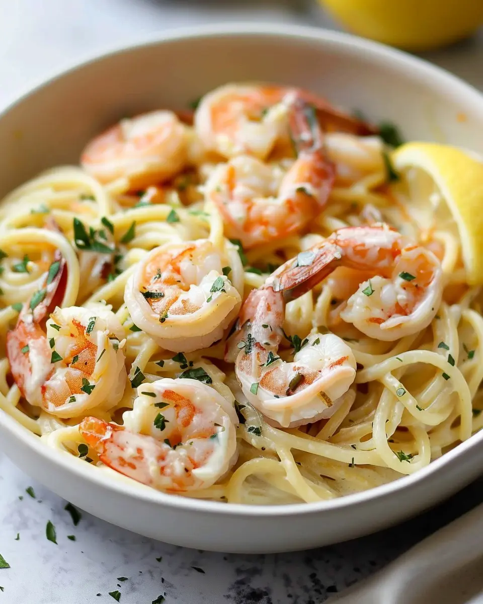 A rich and creamy pasta dish with succulent shrimp and a refreshing lemon flavor.