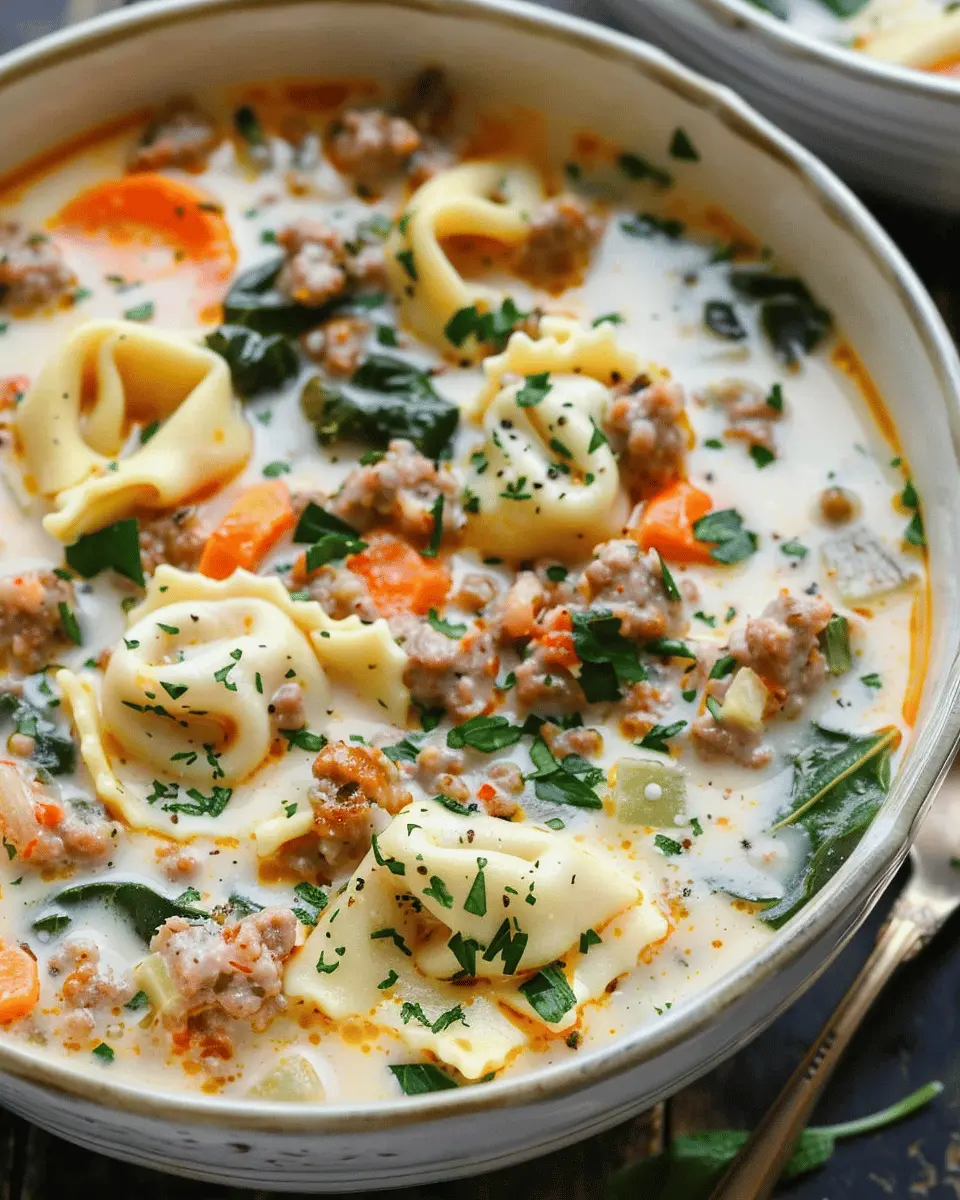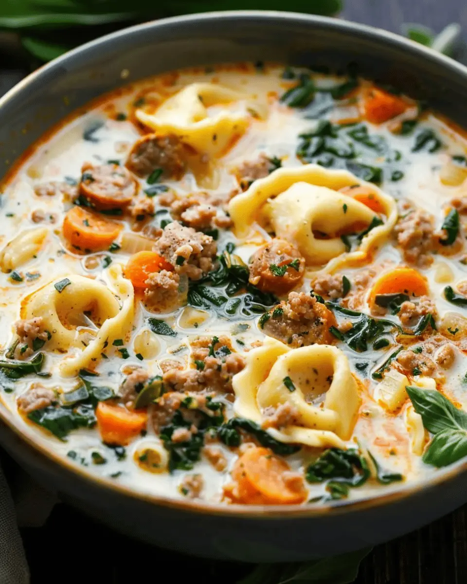Enjoy a comforting bowl of creamy sausage tortellini soup packed with flavor and warmth.