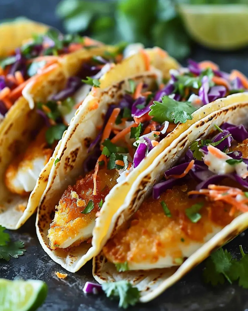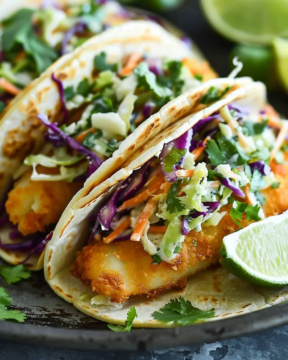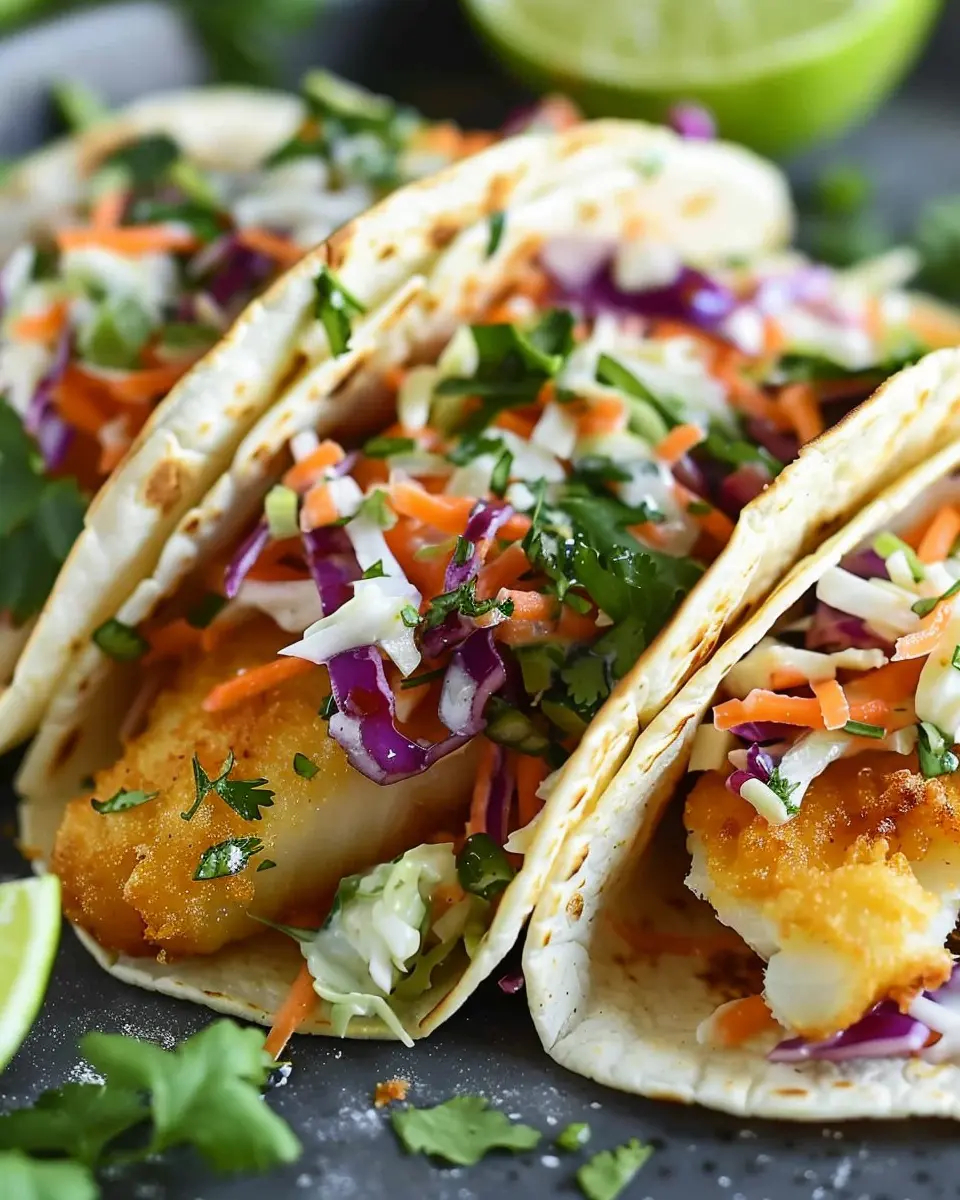 Enjoy the perfect blend of crispy fish and zesty cilantro lime slaw in these delightful homemade tacos.