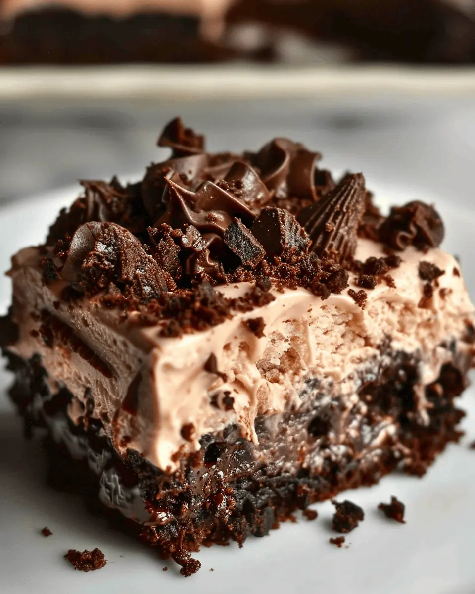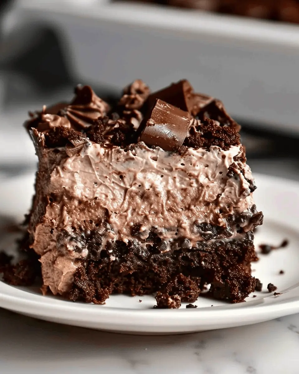 3. Add another layer of crumbled chocolate cake and the remaining pudding mix on top.