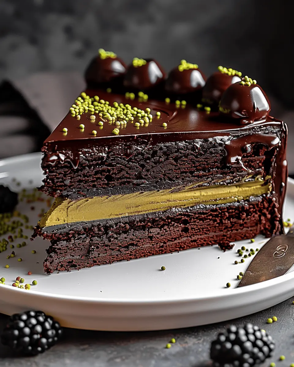 To assemble, place one layer of chocolate cake on a serving plate. Spread an even layer of pistachio filling on top, followed by the second layer. Pour the ganache over the top, letting it cascade down the sides for a gorgeous finish.