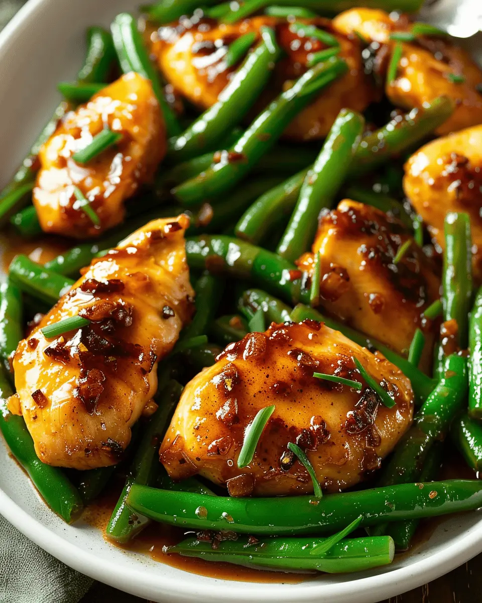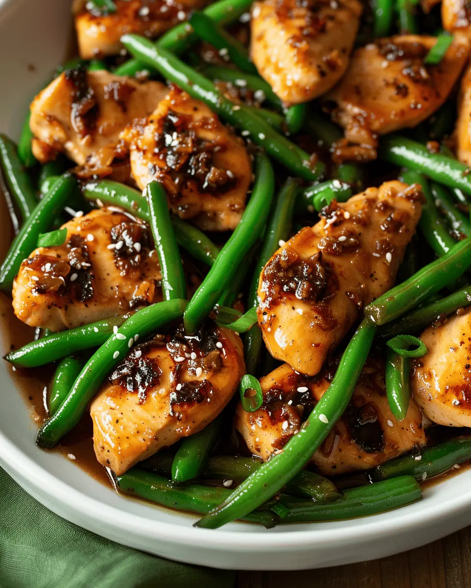 Now comes the fun part—serving your dish! Place the chicken and green beans on a plate, and consider garnishing with fresh herbs like parsley or a sprinkle of sesame seeds for texture.