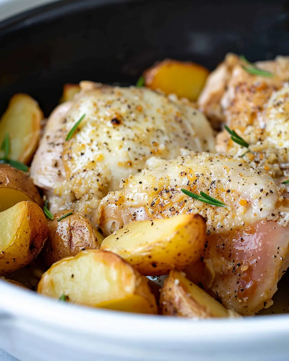 A delicious and easy recipe for Parmesan garlic chicken and potatoes cooked in a slow cooker, perfect for busy families.