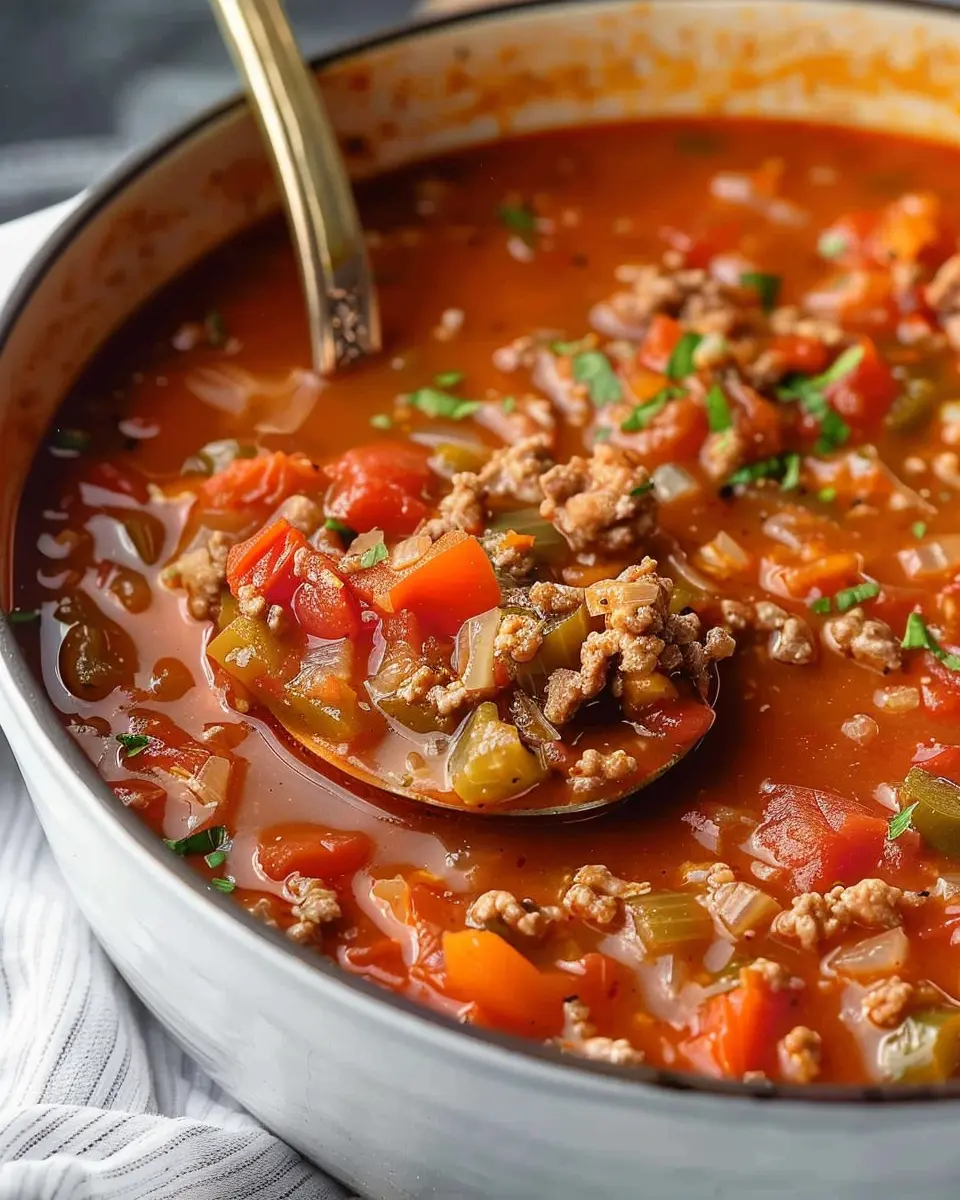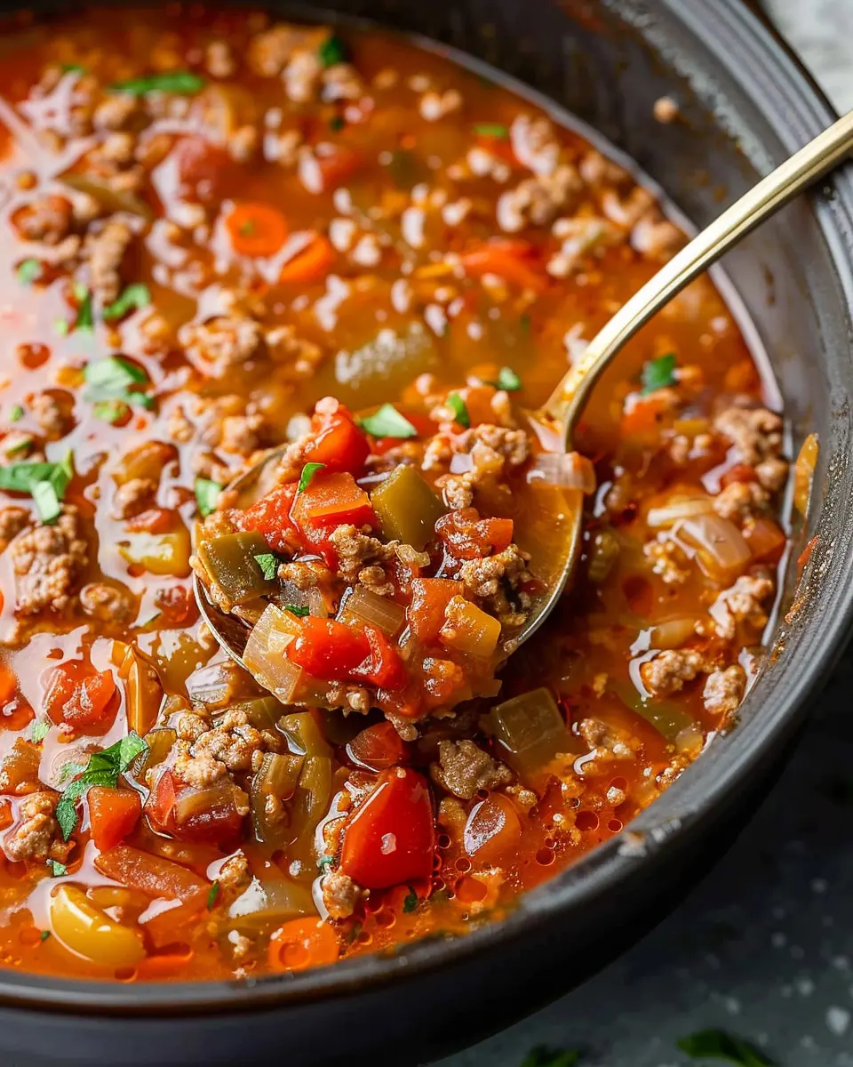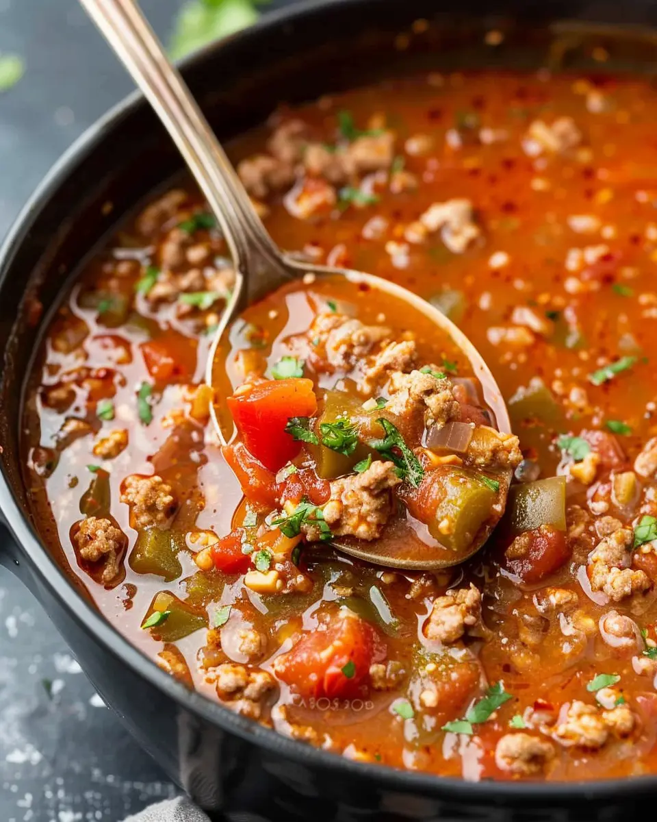 Absolutely! One of the best things about this easy stuffed pepper soup is its freezing capability. To freeze, let the soup cool completely before transferring it to airtight containers or freezer bags. It can last up to three months in the freezer. When you’re ready to enjoy it again, simply thaw it in the refrigerator overnight and reheat on the stovetop. You may need to add a splash of broth or water to regain the desired consistency.