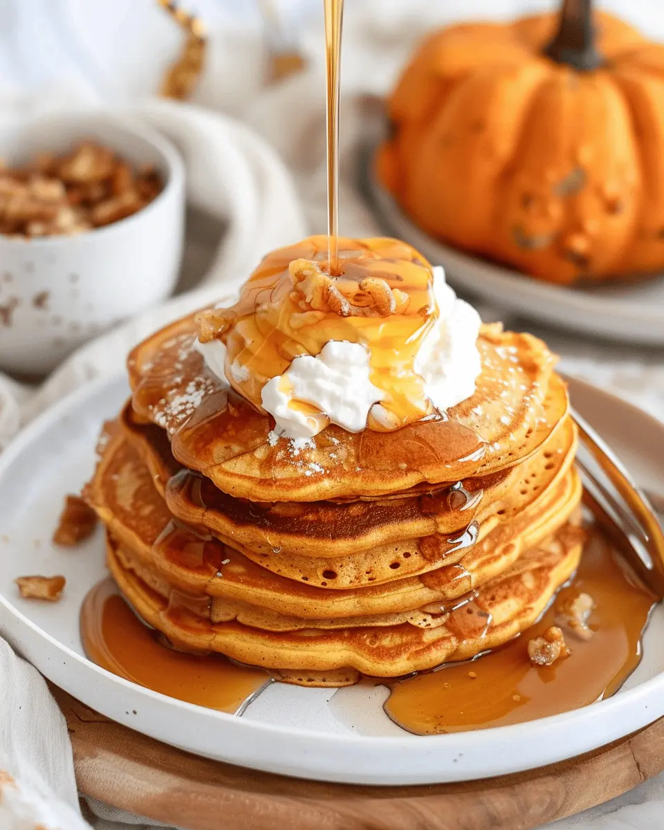 Deliciously fluffy pumpkin pancakes topped with sweet maple syrup and creamy whipped topping, perfect for breakfast.