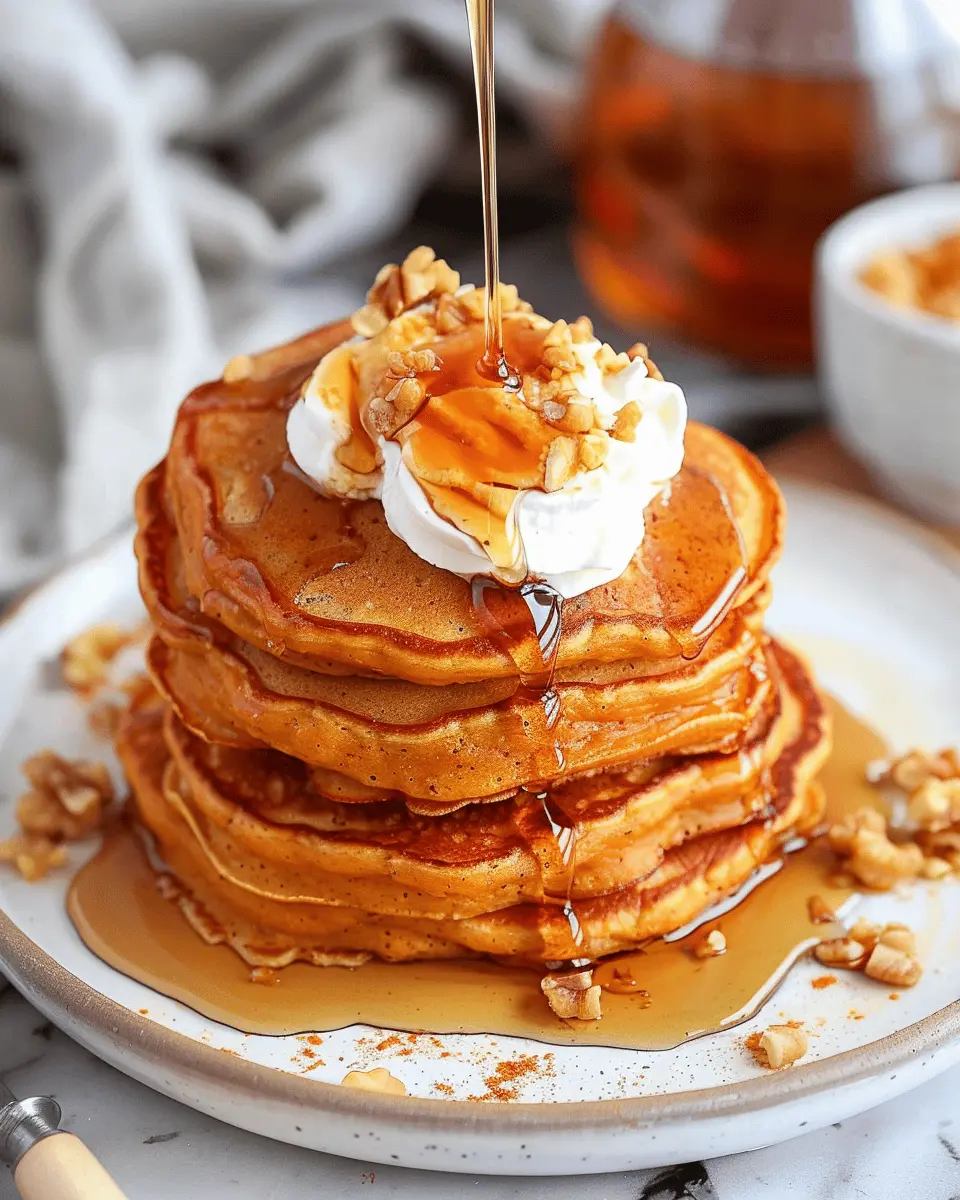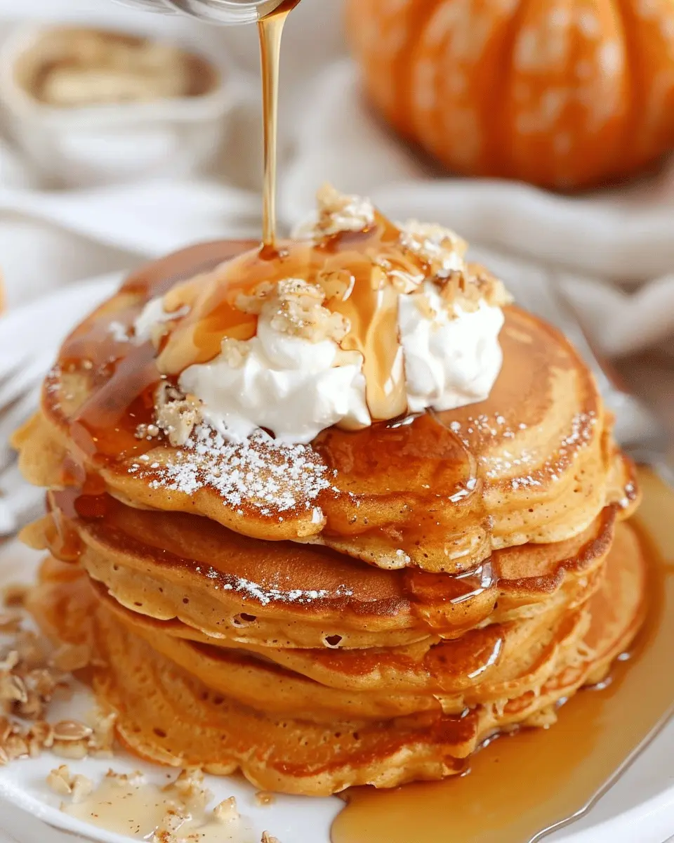 Deliciously fluffy pumpkin pancakes topped with sweet maple syrup and creamy whipped topping, perfect for breakfast.
