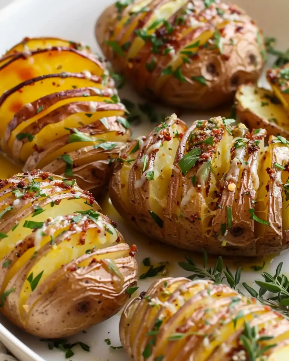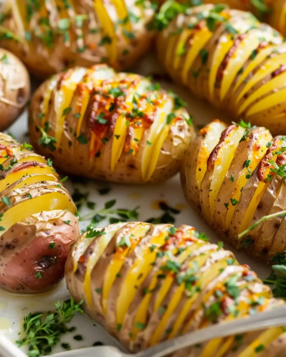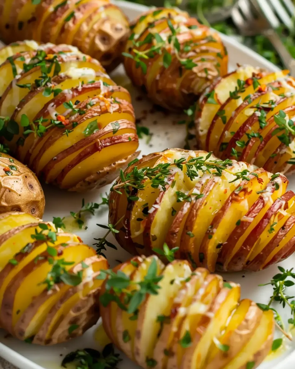 Remember, the beauty of Hasselback potatoes lies in their versatility. Feel free to experiment with different toppings or seasonings based on your preferences! Enjoy your crispy, herby masterpiece.