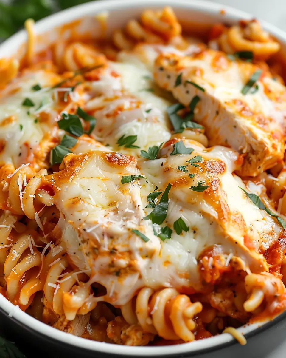 - Combine Ingredients: In a large bowl, mix the drained rotini with the chicken pieces and marinara sauce. Stir gently to ensure the pasta is evenly coated and the chicken is well-distributed.