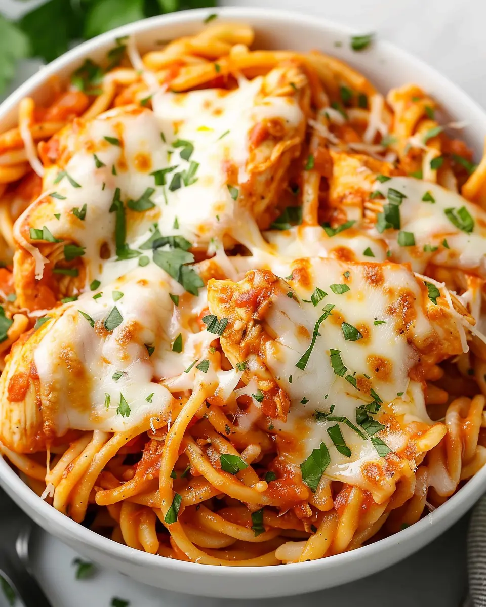 - Combine Ingredients: In a large bowl, mix the drained rotini with the chicken pieces and marinara sauce. Stir gently to ensure the pasta is evenly coated and the chicken is well-distributed.