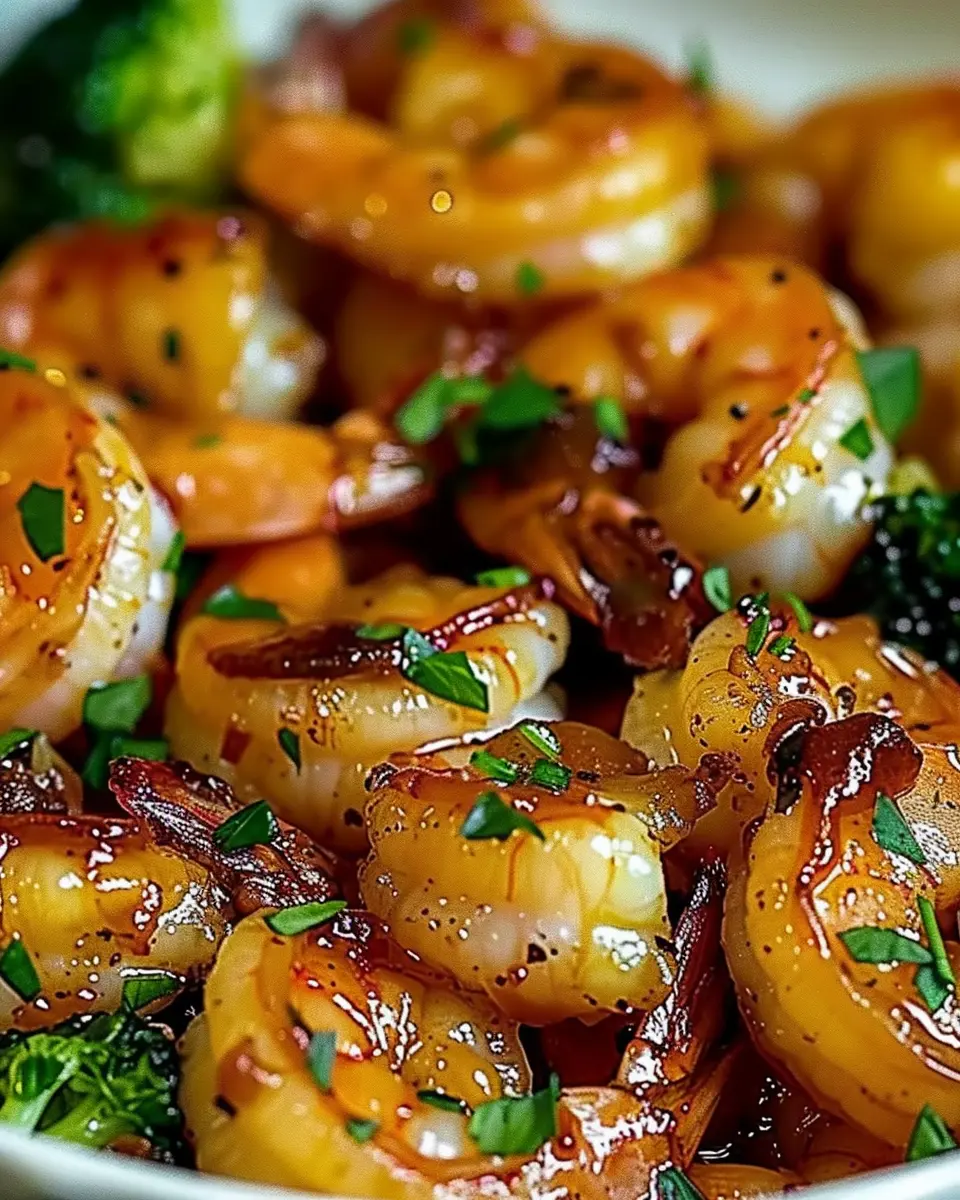 Enjoy a delicious and nutritious dish with this High-Protein Honey Garlic Shrimp recipe, featuring a twist of turkey bacon for extra flavor.