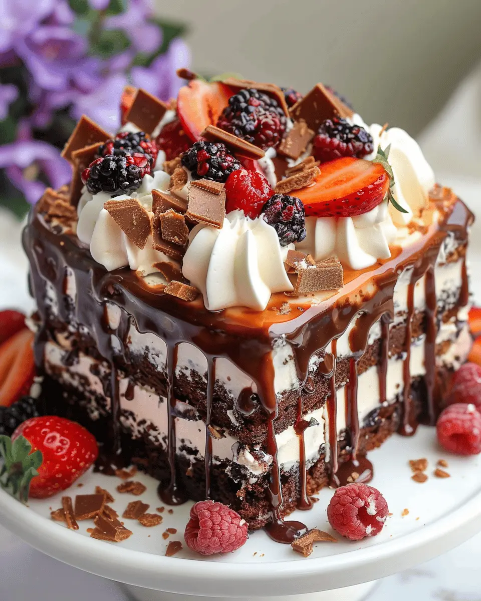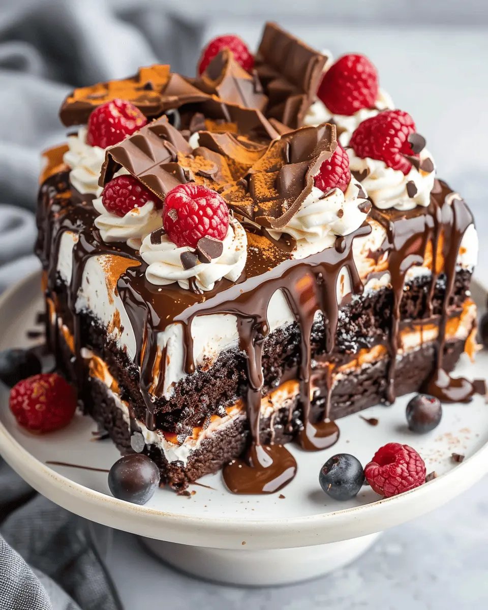 - Bake the cake layers separately and then once cooled, spread a generous amount of fudge between them before covering the entire cake with a glossy ganache.