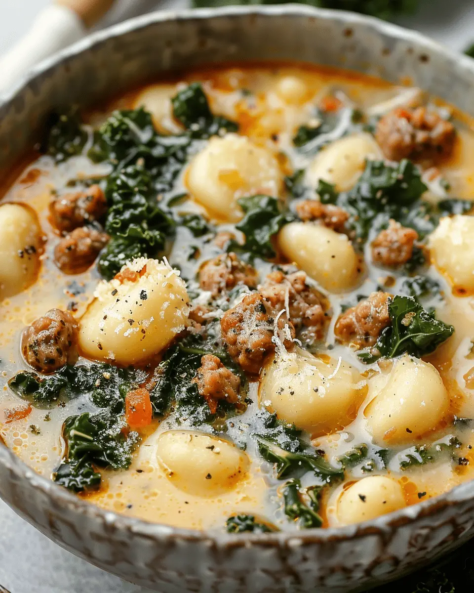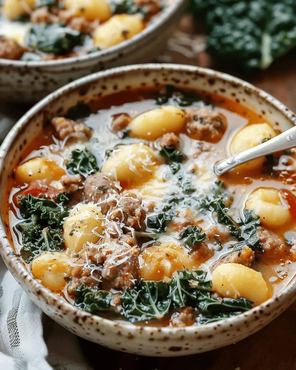 A comforting soup featuring savory Italian sausage, nutritious kale, and tender gnocchi that warms the soul.