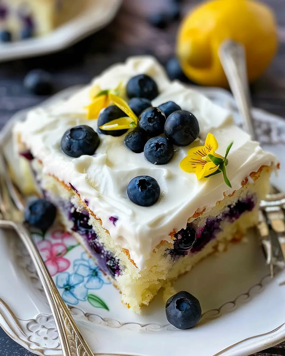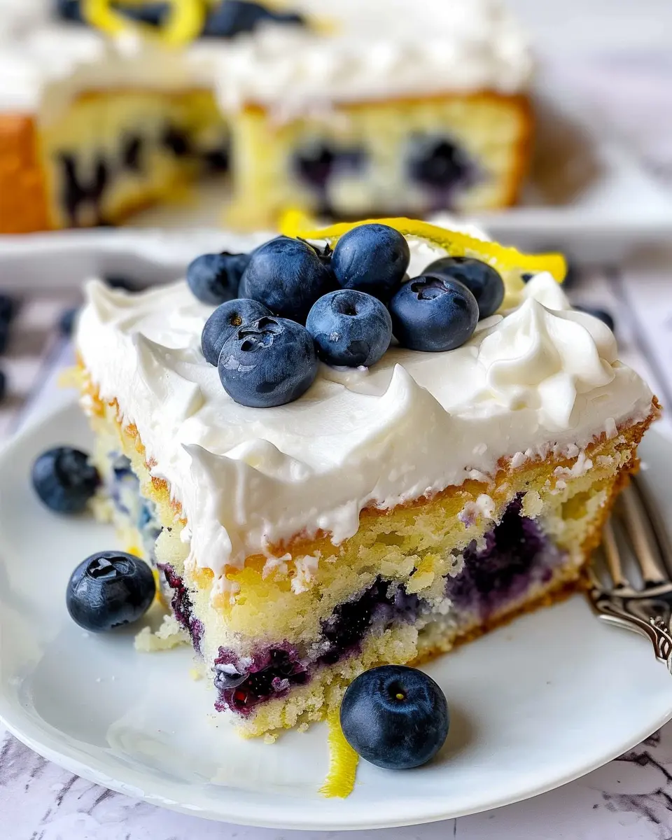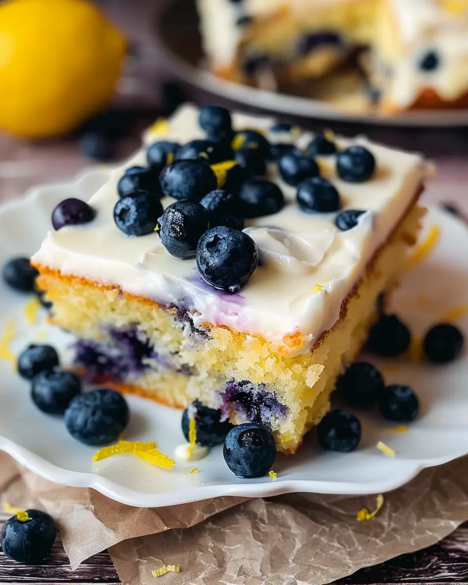 But it’s not just about flavor; it’s also about texture. The moistness of the cake, combined with the bursts of juicy blueberries and the light, fluffy lemon frosting, makes each bite a pleasurable experience. It’s the kind of cake that begs to be shared—perfect for picnics, brunches, or just a casual gathering with friends. Imagine cutting into a beautifully glazed sheet cake and seeing that swirl of vibrant purple against the sunny yellow—talk about a showstopper!