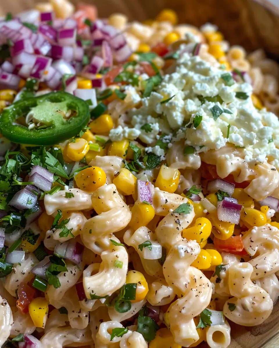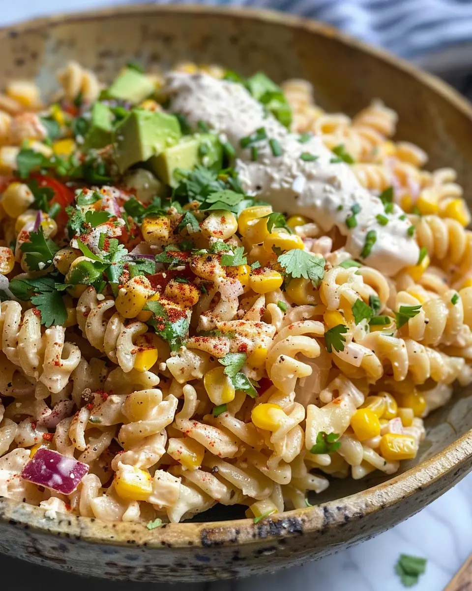 Imagine biting into creamy, zesty flavors bursting from each forkful. This pasta salad isn’t just about taste; it also brings together a variety of colorful ingredients that make it visually appealing—a playful twist on the traditional recipe you might find at street vendors in Mexico.