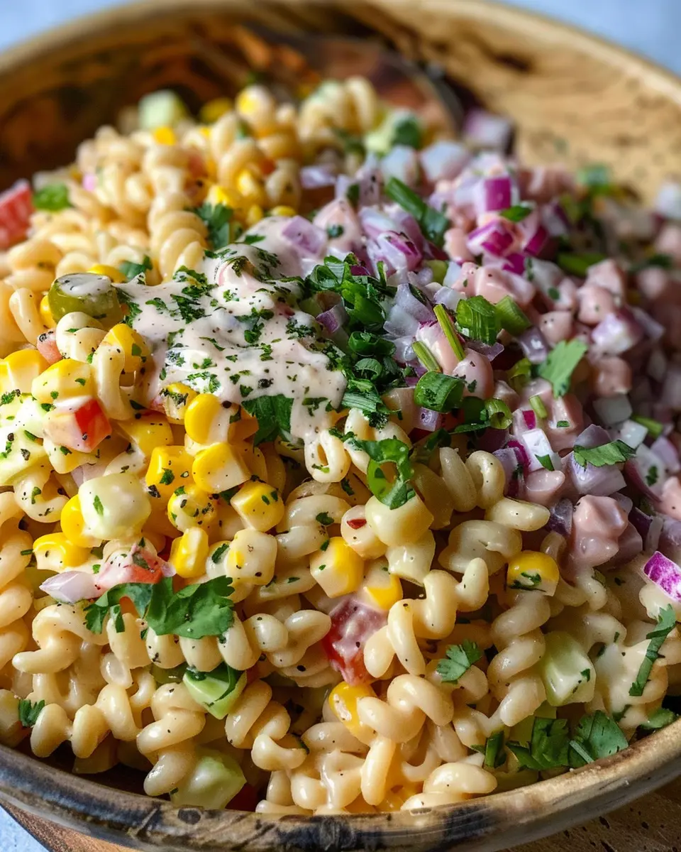 PrintMexican Street Corn Pasta Salad Recipe with Creamy Turkey Bacon Delight