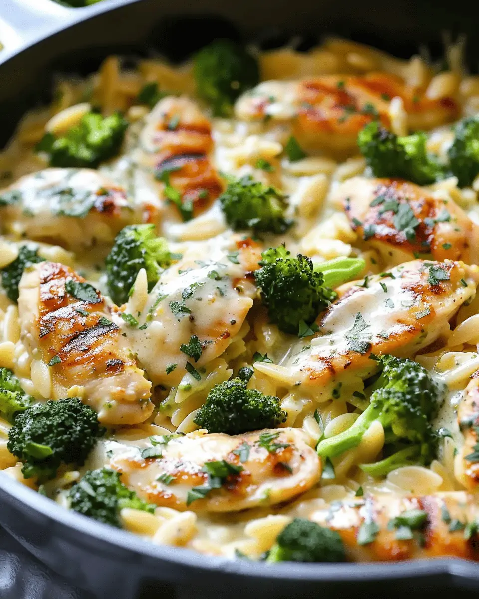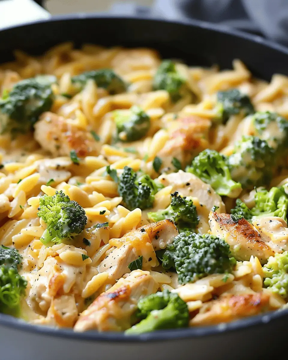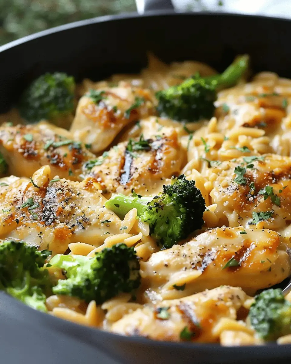 A convenient and delicious meal that combines tender chicken, broccoli, and cheesy orzo all in one pot.