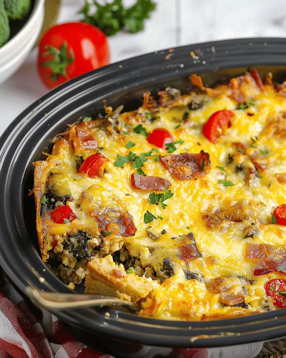 Absolutely! One of the best features of an overnight crockpot breakfast casserole is its convenience. You can prepare all the ingredients — such as eggs, Turkey Bacon, Chicken Ham, and veggies — the night before. Just layer everything in the crockpot, cover it, and place it in the fridge. In the morning, simply set the crockpot on low and let it do the work while you enjoy the extra time in bed.