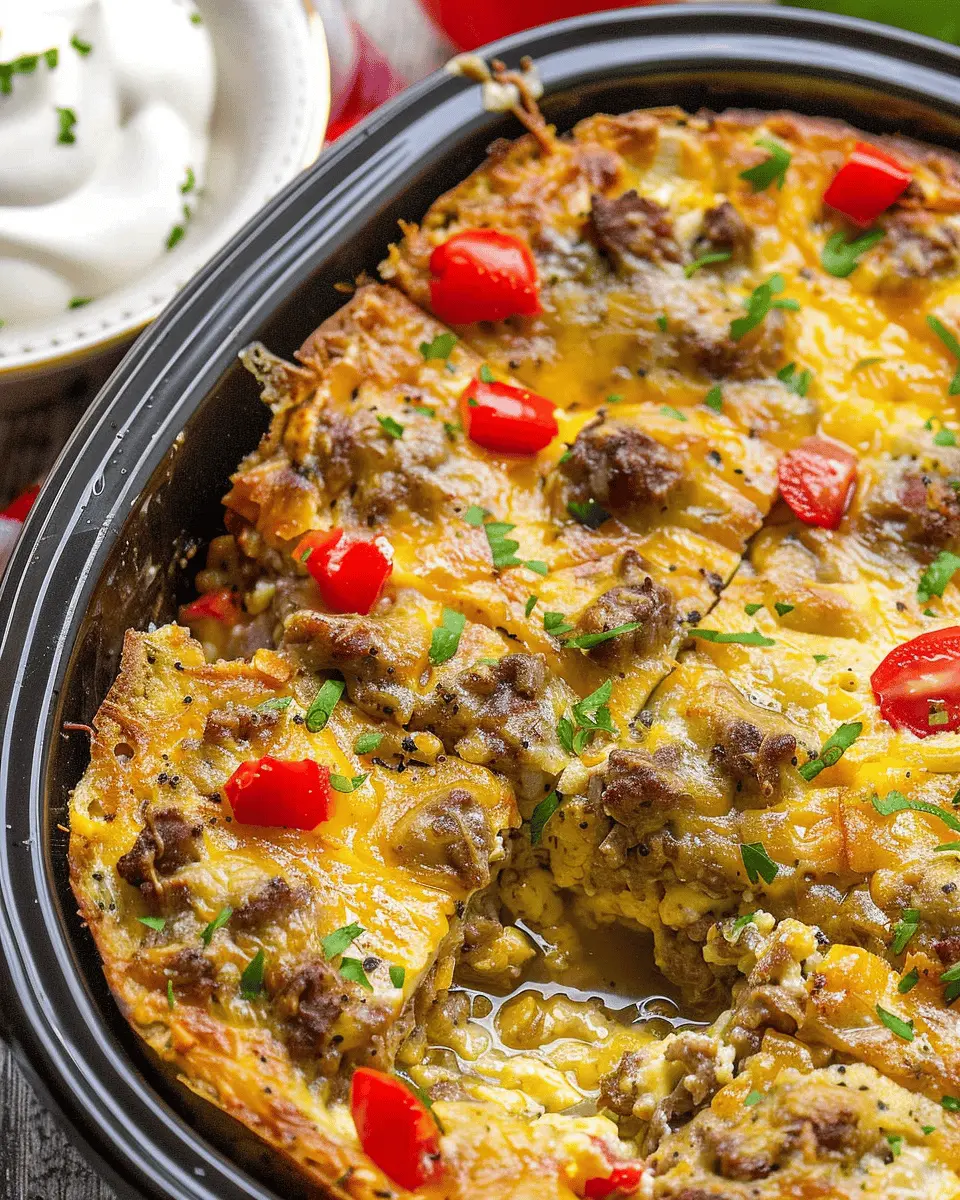 Now that the groundwork is laid, let’s assemble your overnight crockpot breakfast casserole. Begin by adding a layer of hash browns at the bottom of the crockpot; they act as the perfect base. Next, evenly distribute the sausage and veggie mix over the hash browns. Finally, sprinkle your cheesy mixture on top, ensuring all flavors have a chance to mingle.