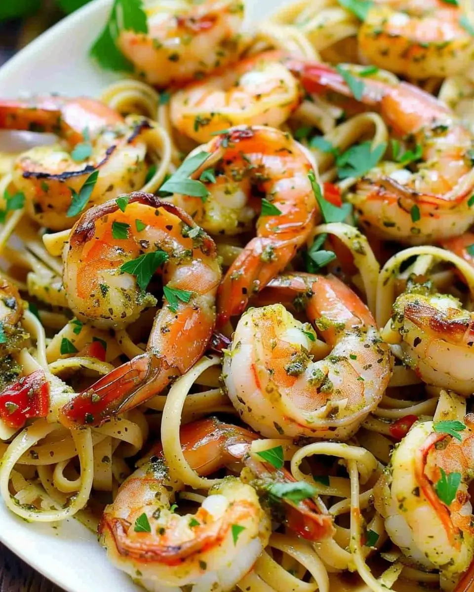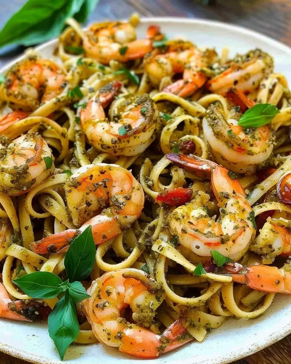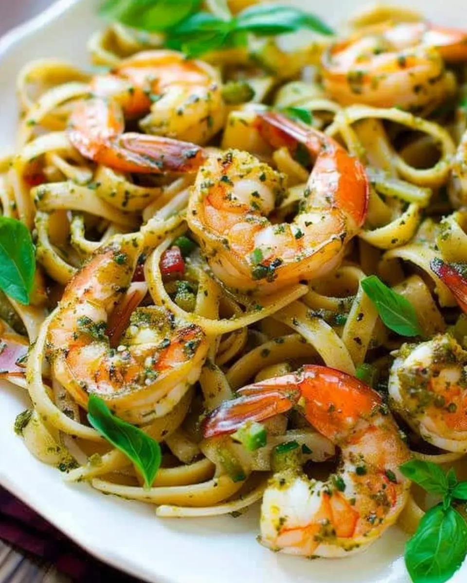 A divine combination of succulent shrimp and creamy pesto sauce served over pasta, perfect for a busy weeknight dinner.