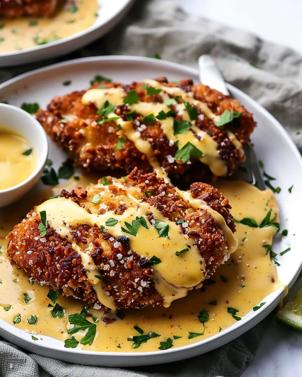 Once your chicken is cooked and the sauce is ready, it’s time to plate! Place the chicken on a serving dish, spoon the cheddar-mustard sauce generously over the top, and garnish with fresh herbs like parsley or chives. Serve it with your choice of side—perhaps a fresh salad or roasted vegetables make for a perfect pairing. Enjoy your homemade Pretzel Crusted Chicken; it’s sure to impress any guest!