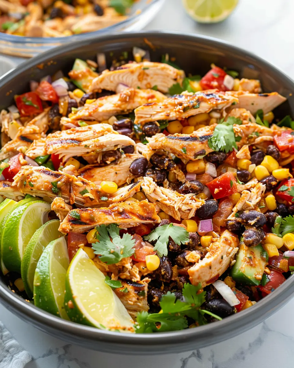 Now it’s time to mix the fun stuff! In a large bowl, place the cooked chicken, black beans, corn, diced bell peppers, avocado, and cherry tomatoes. Add the freshly chopped cilantro and the crumbled turkey bacon for that smoky, savory flavor. This combination not only adds color but also a variety of textures that make each bite exciting.