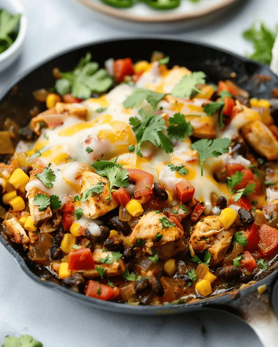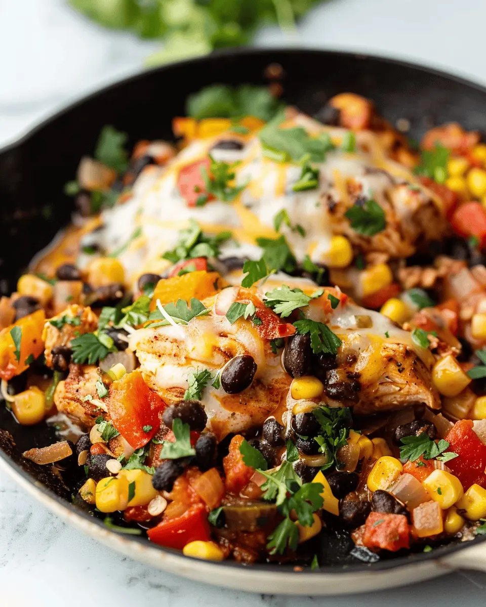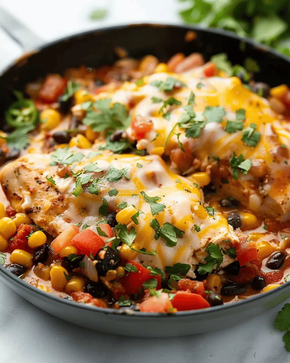 Enjoy a quick and delicious Santa Fe Chicken Skillet, perfect for a weeknight dinner.