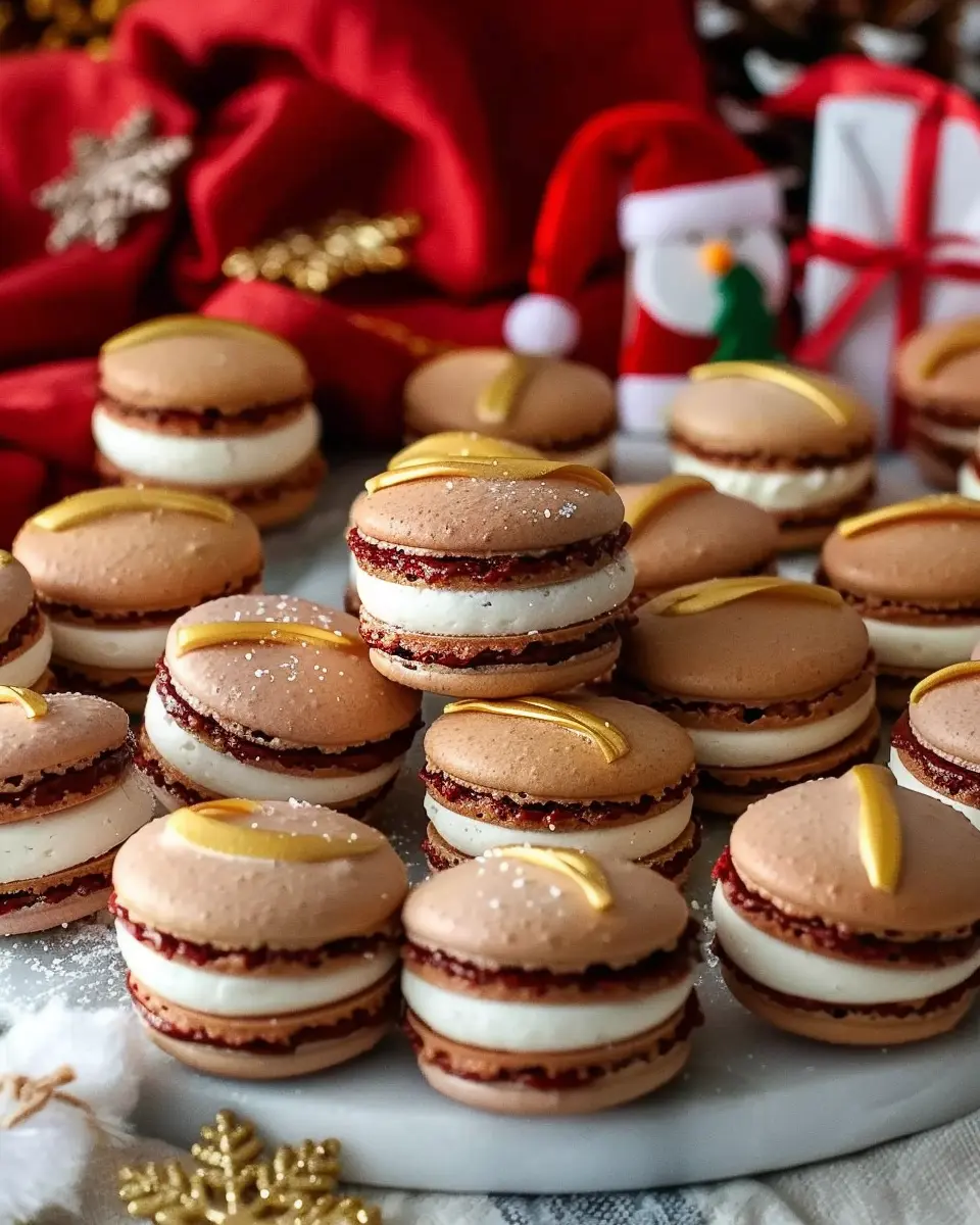 For those who can’t resist chocolate, chocolate ganache-filled Santa macarons are an absolute must! This variation combines the classic macarons with a rich and velvety ganache. The sweetness of the macaron shell perfectly complements the deep, intense flavor of the chocolate.