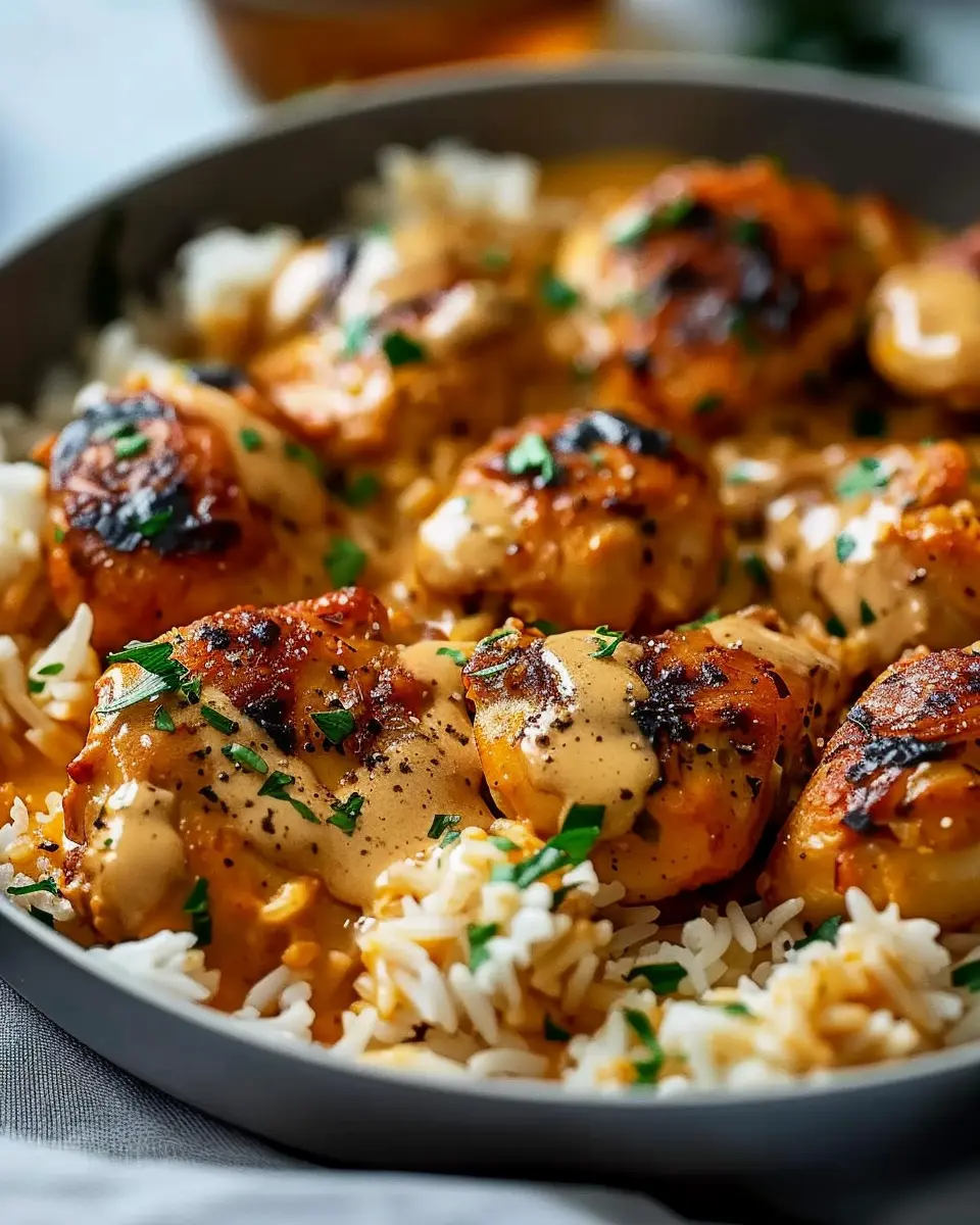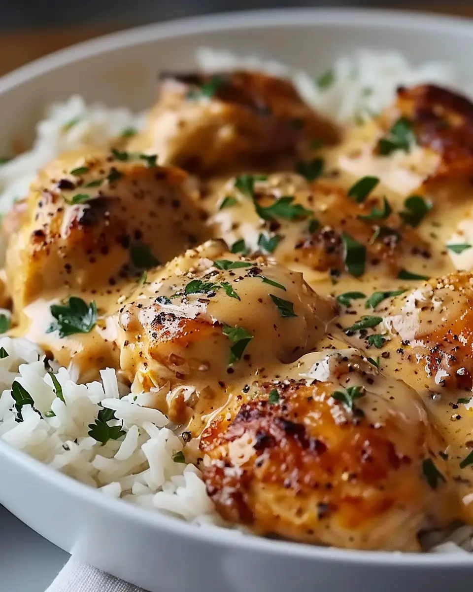 • Top it off: Spoon the cheesy, creamy chicken and sauce over the rice. Don’t forget to drizzle any extra sauce around the plate for presentation.
