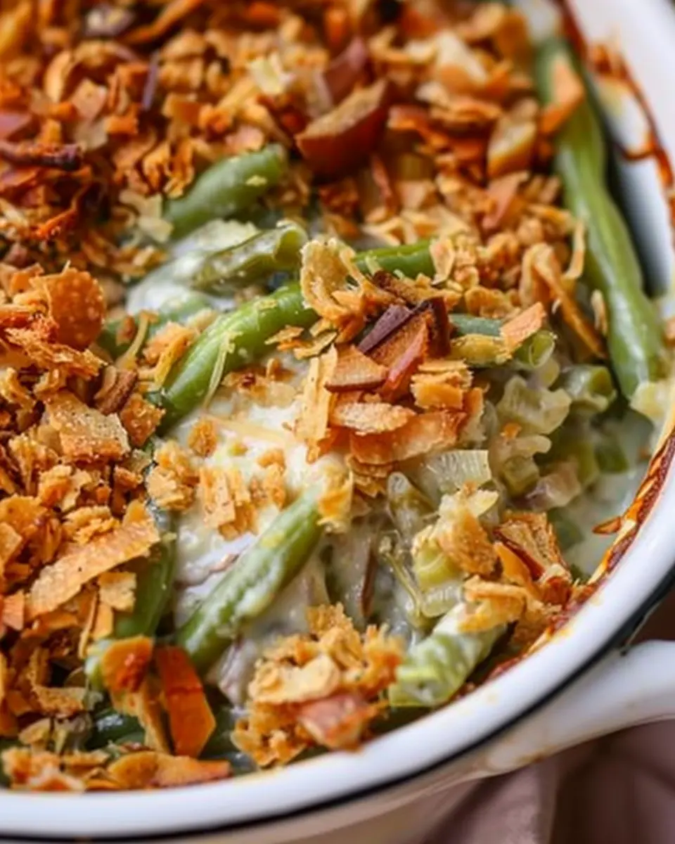 A delightful Southern green bean casserole recipe featuring turkey bacon for a healthier twist.